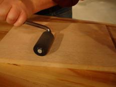 Drill a 1/2" hole through one side of the smaller piece of hardwood. The hole will hold the 1/2" dowel. On the same side of the small block as the 1/2" hole, drill the block into place on the center of one long edge of the 24" piece of hardwood.