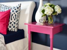 We reinvented an old flea market dresser, turning it into a combination bedside table and pet bed. To do so, we cut out the bottom two drawers, relined the inset with beadboard, then painted the entire unit a fun color. Finally we added an inviting cushion, making it a perfect hideaway for a small dog or cat.